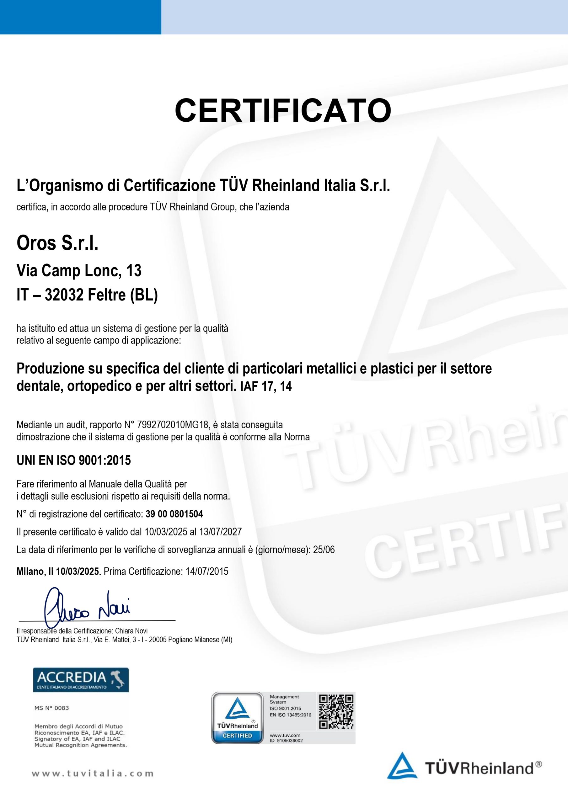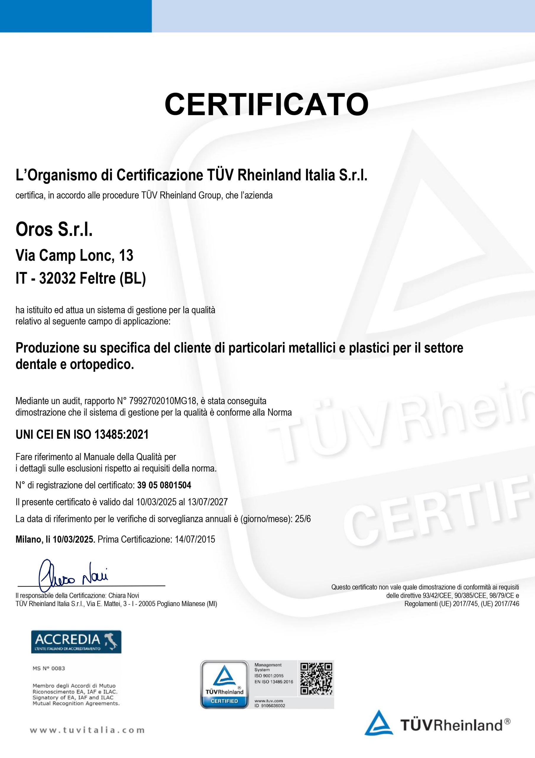 La qualità in Oros è un dato oggettivo e certificato. Il nostro sistema di gestione interno è conforme alla norma ISO 9001, mentre la specifica certificazione ISO 13485 ci abilita alla produzione di componenti per dispositivi medici, garantendo processi governati, sicuri e ripetibili per ogni fornitura.